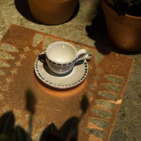 Tazzina da caffè con piattino in ceramica con smalto bianco e fascia decorata a mano.