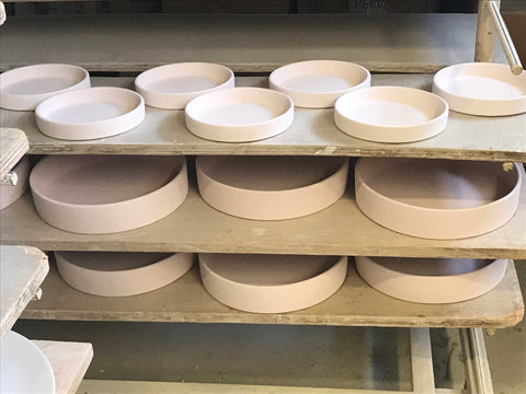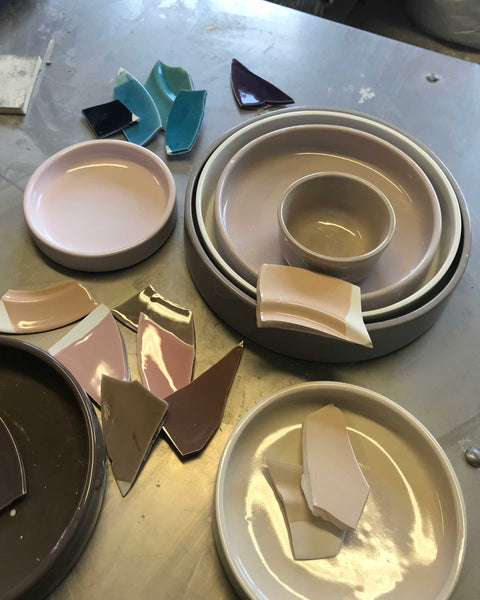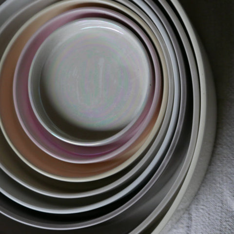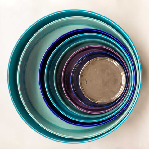 Set six + set two ceramic concentric platter varying sizes and height inside one another.