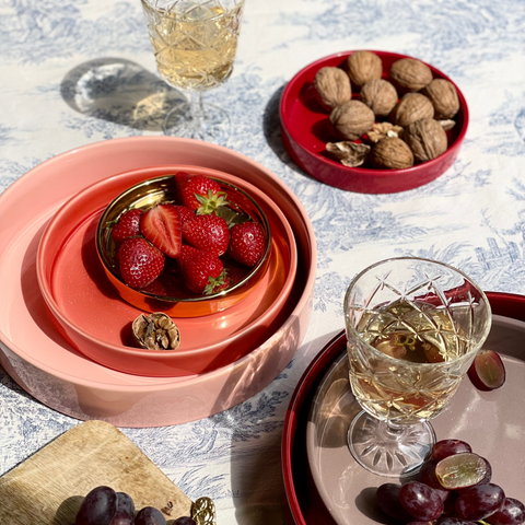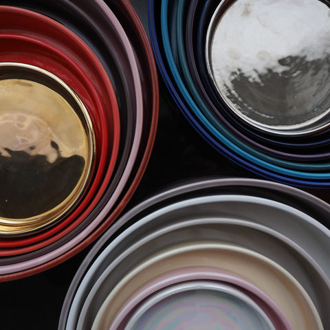Set di 6 vassoi da portata rotondi in ceramica, realizzati a mano, con diametro e altezza variabili.