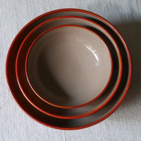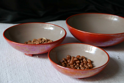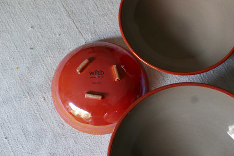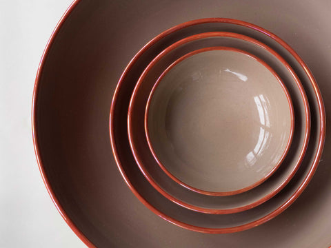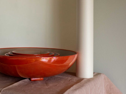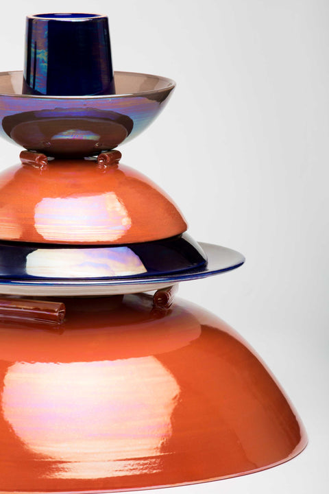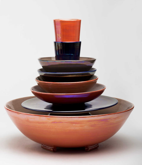 Each of the three series is produced in three different colours: ink blue, flame orange and taupe, ”lustered” on the external surfaces and a warm and intense cream colour applied to the interior of all the pieces.