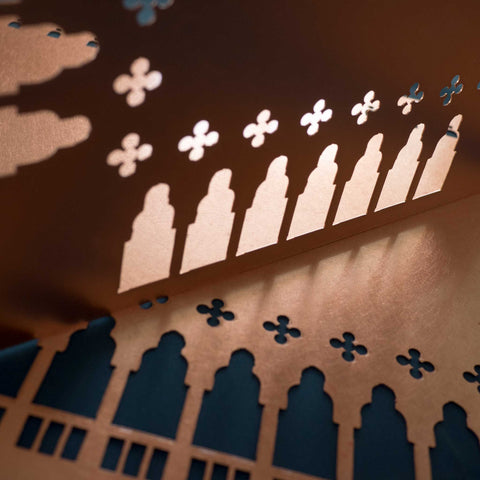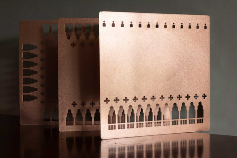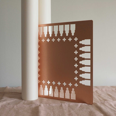 Lastra di rame tagliata e curvata tramite trafila, secondo le forme degli elementi architettonici che caratterizzano l'architettura dei palazzi veneziani del XVI secolo.