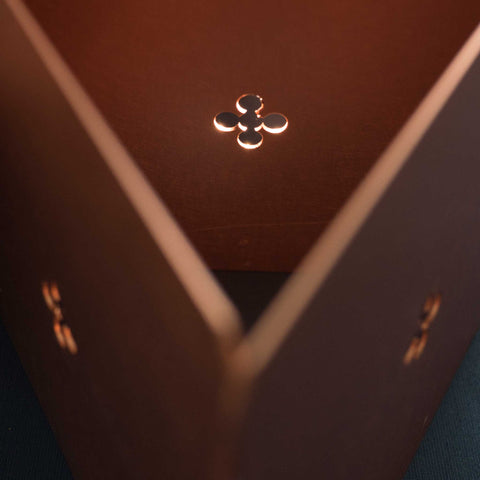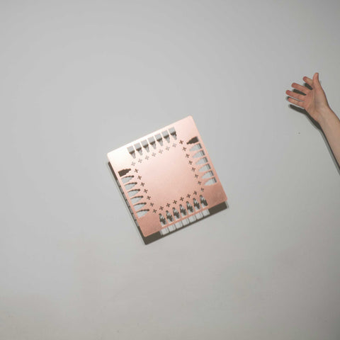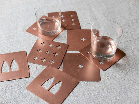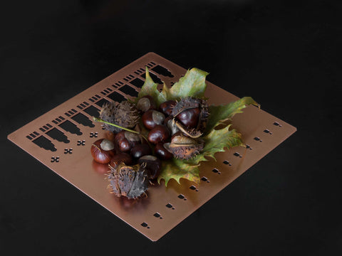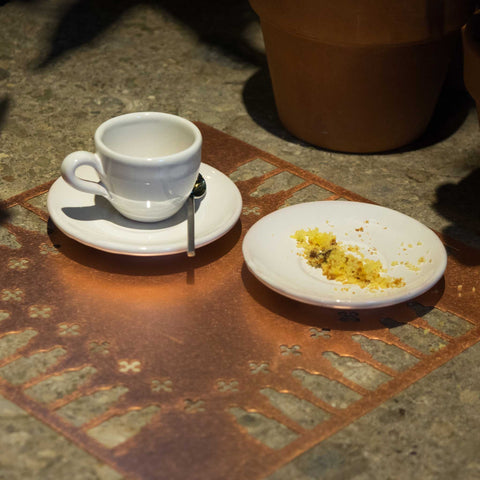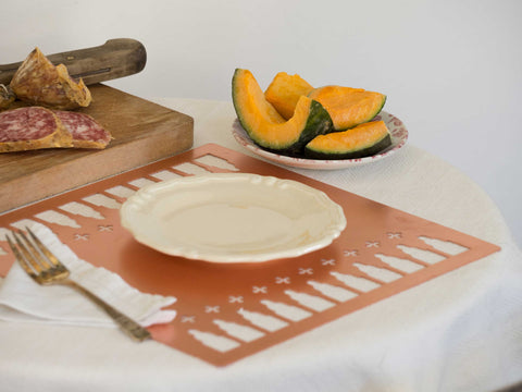 Il Rame. Quello dei tetti di Venezia e delle sue gronde: un materiale sempre in bilico tra luce e acqua, Proprio come la sua città Serenissima. Nell'interpretazione di Wftb, il più antico dei metalli continua la sua storia: diventa una lastra piana, una superficie sospesa tra il cibo e la tavola, un vassoio, un piatto servito, una tovaglietta.
